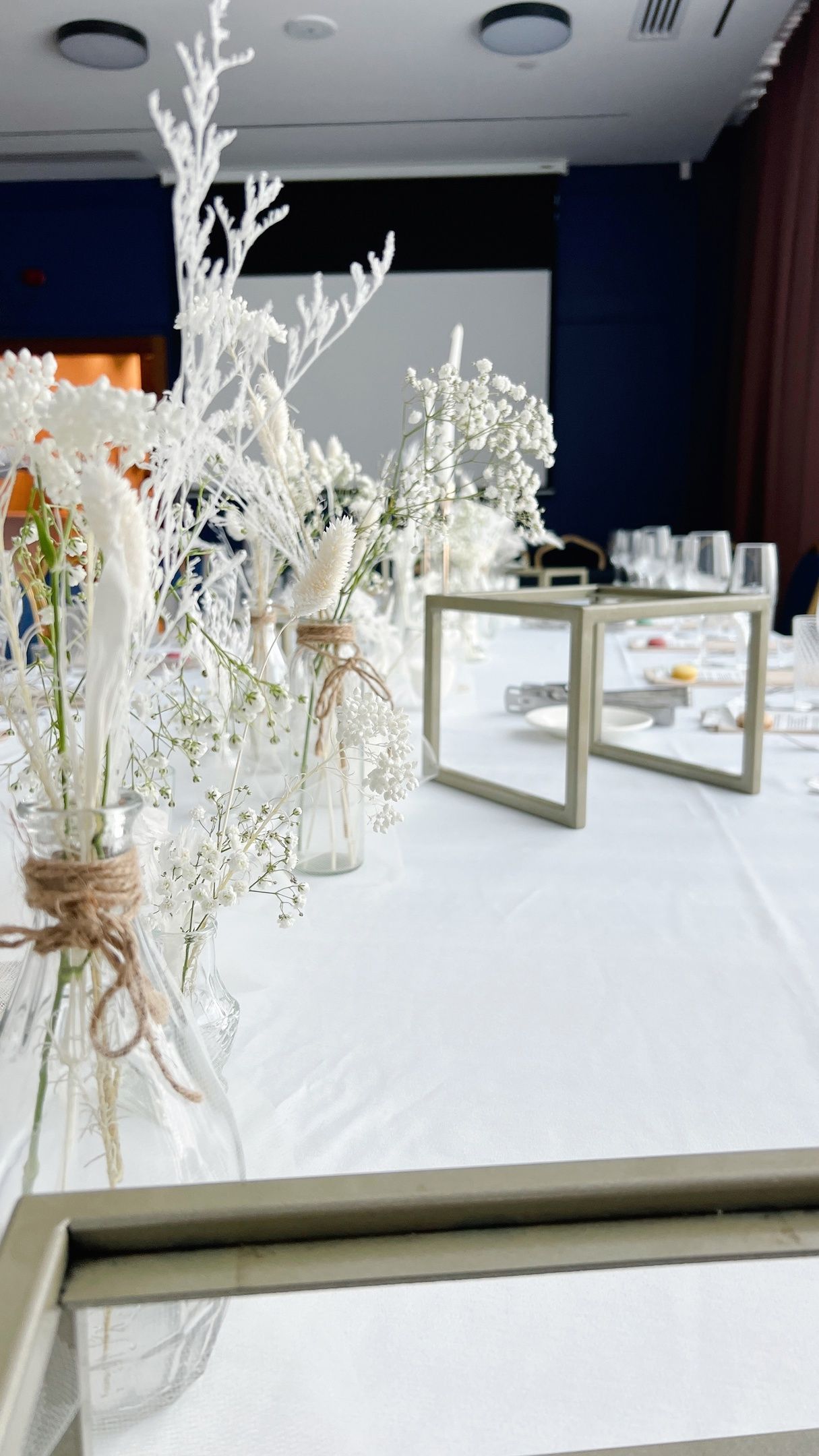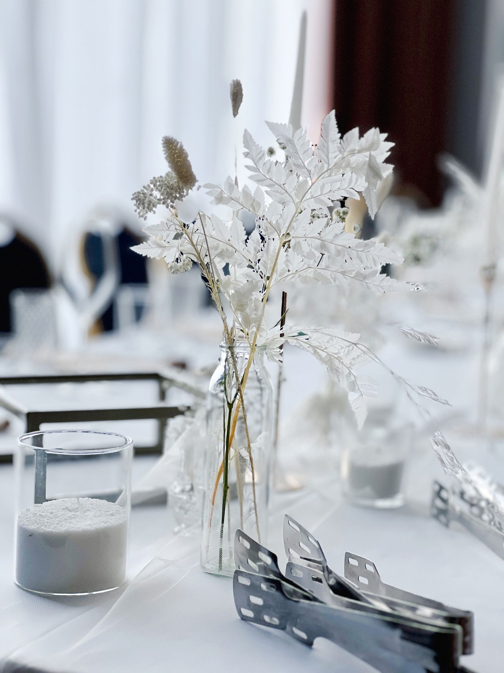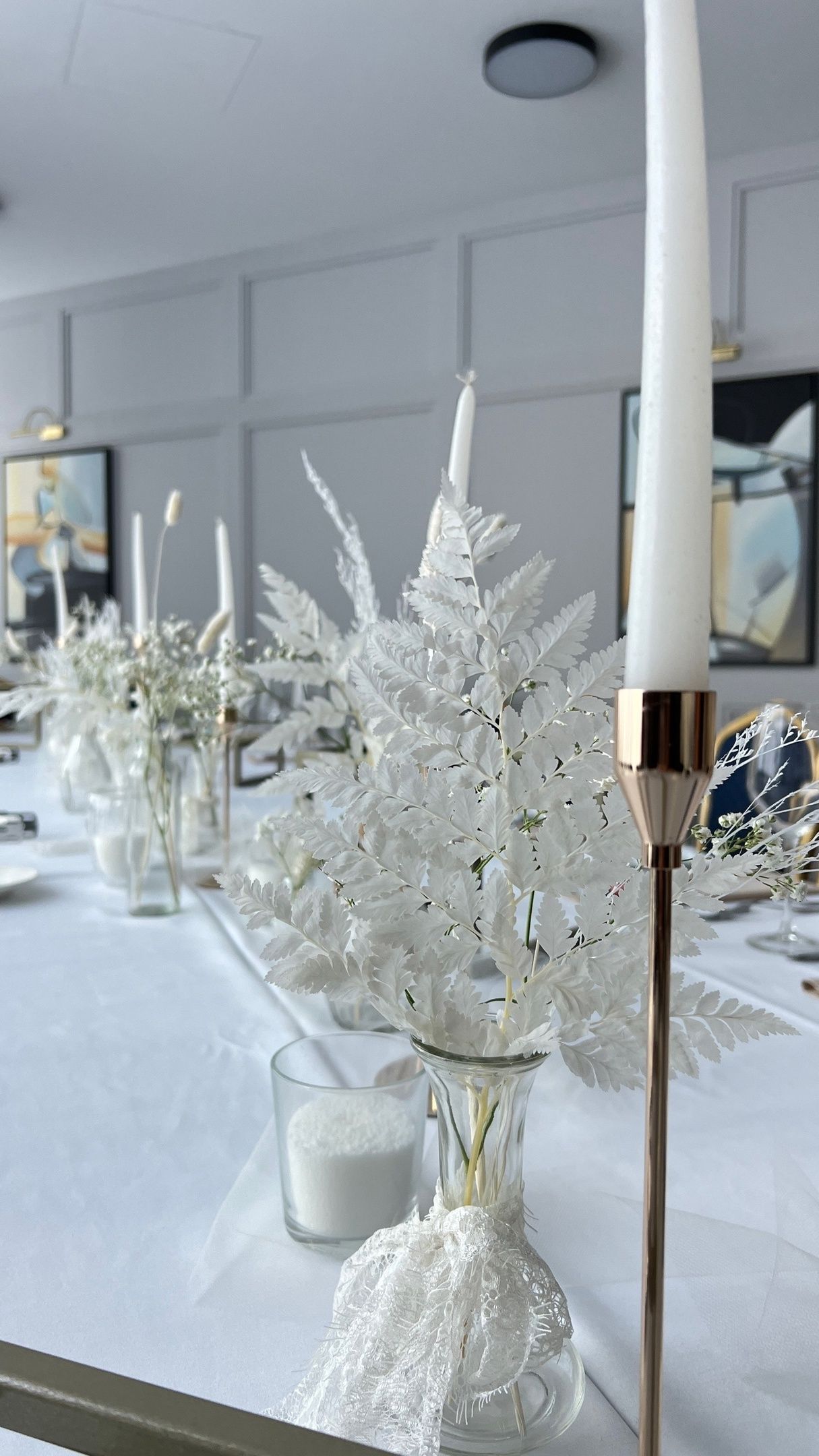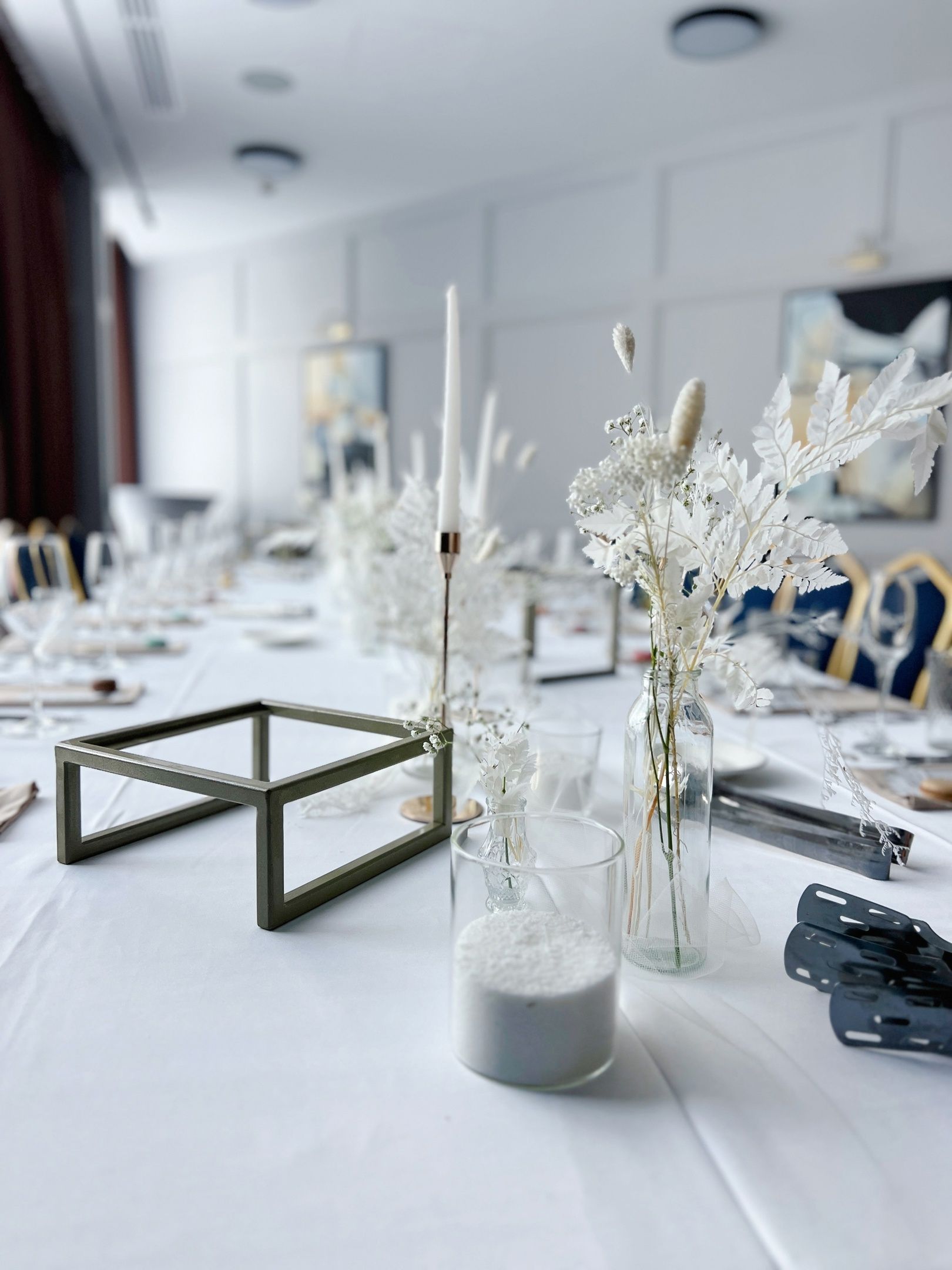 15 разноразмерных насыпных свечей, набор разноразмерных ваз 3-4 вида 14шт, флористических композиций из стабелизированных цветов с сухоцветами и гипсофилой.